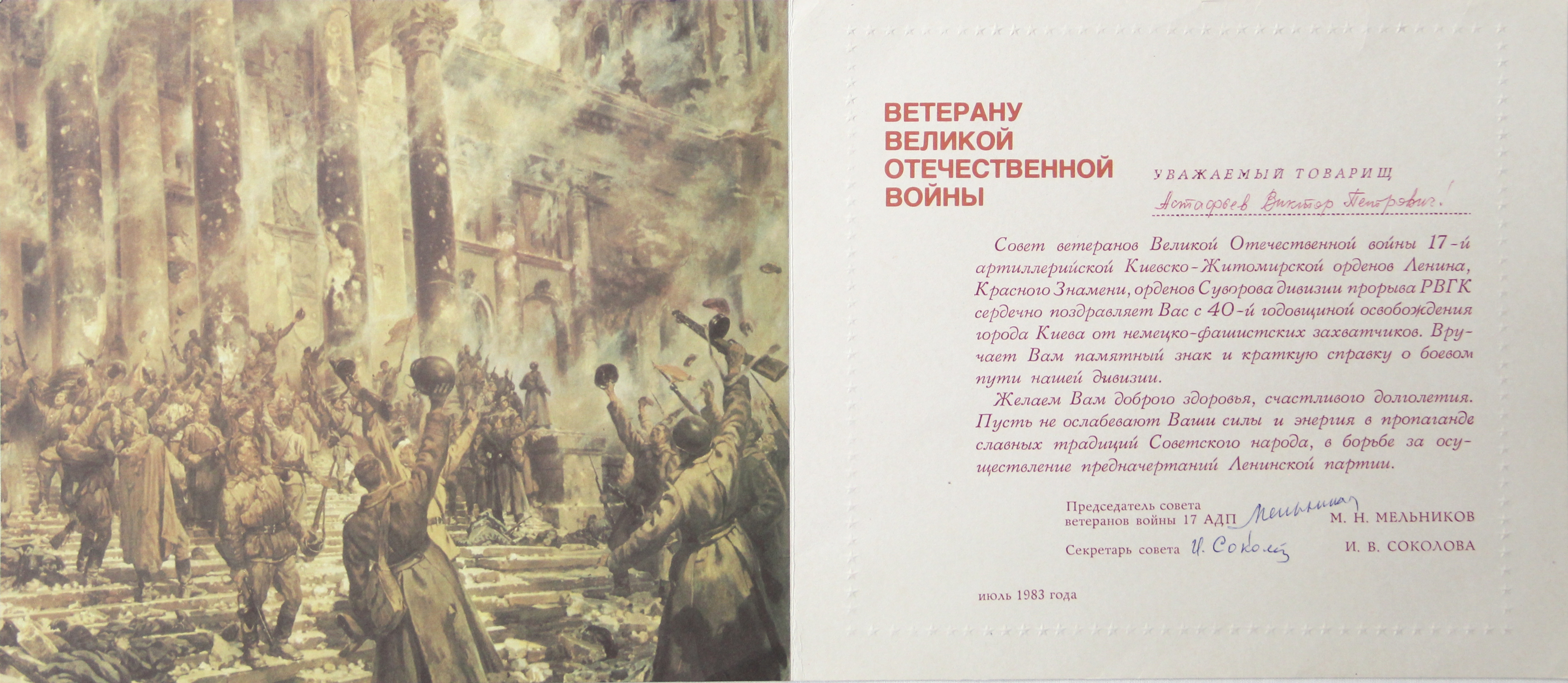 Поздравительный адрес Совета ветеранов 17-й артиллерийской дивизии прорыва Виктору Астафьеву в связи с 40-й годовщиной освобождения Киева. 1983
